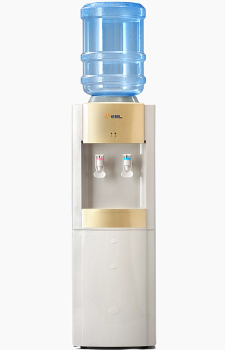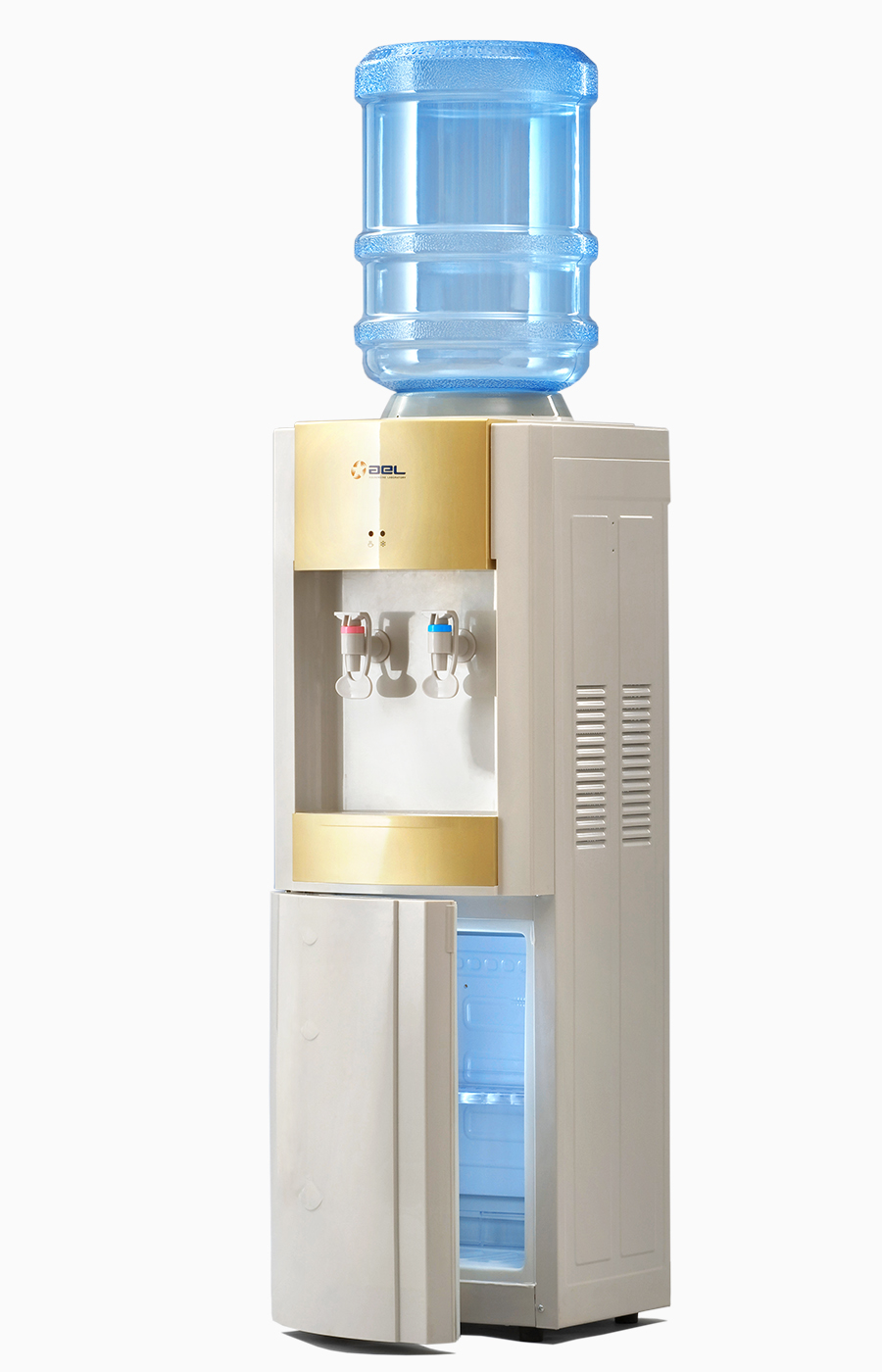 Напольный компрессорный кулер для воды в классическом корпусе с золотистыми вставками. Оснащен холодильником для хранения напитков и продуктов на 20 литров (≅260х210х360 мм). Комфортной эксплуатации способствует наличие кранов с функцией "нажим кружкой". Обеспечивает охлаждение 2 литров и нагрев 5 литров воды в час. Корпус состоит из легкосменных панелей, изготовленных из высококачественного пластика. При необходимости нагрев и охлаждение воды можно отключить с помощью тумблеров, расположенных на задней панели аппарата.