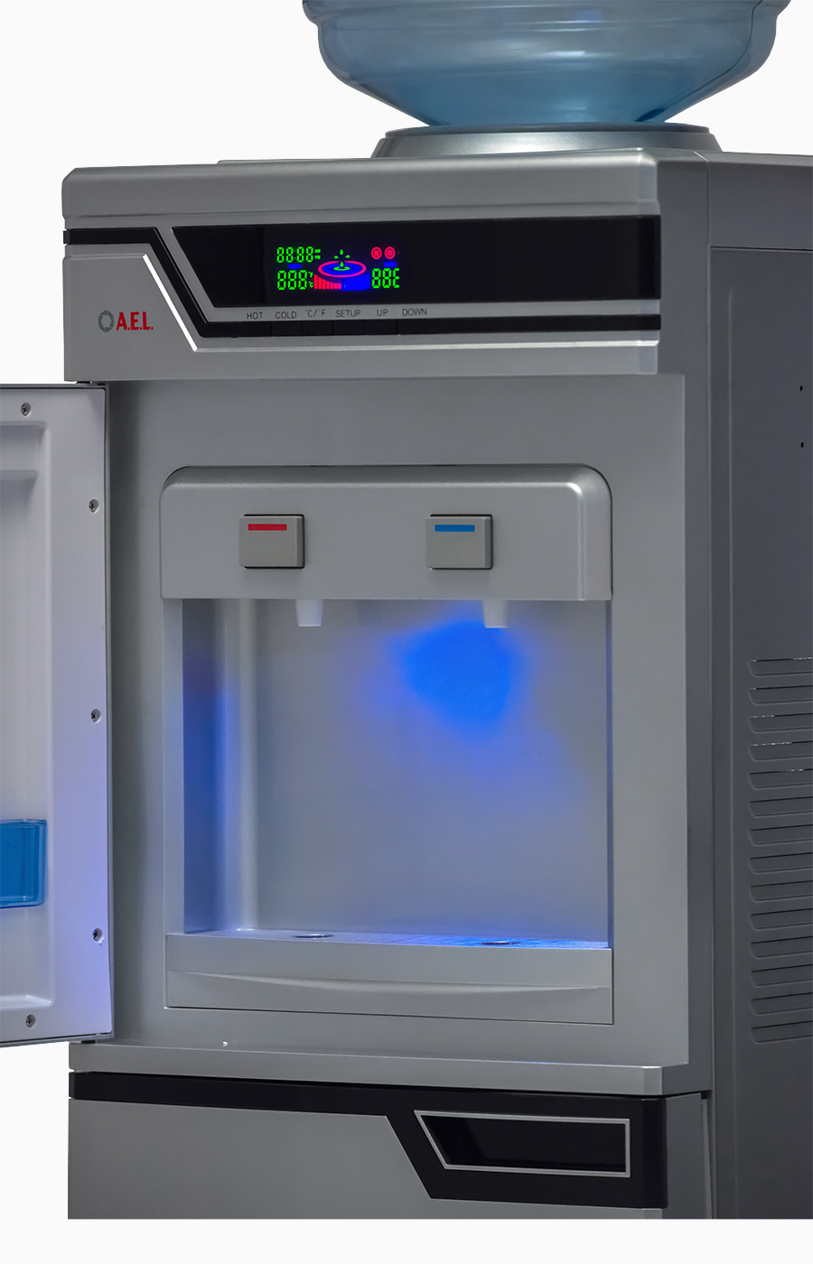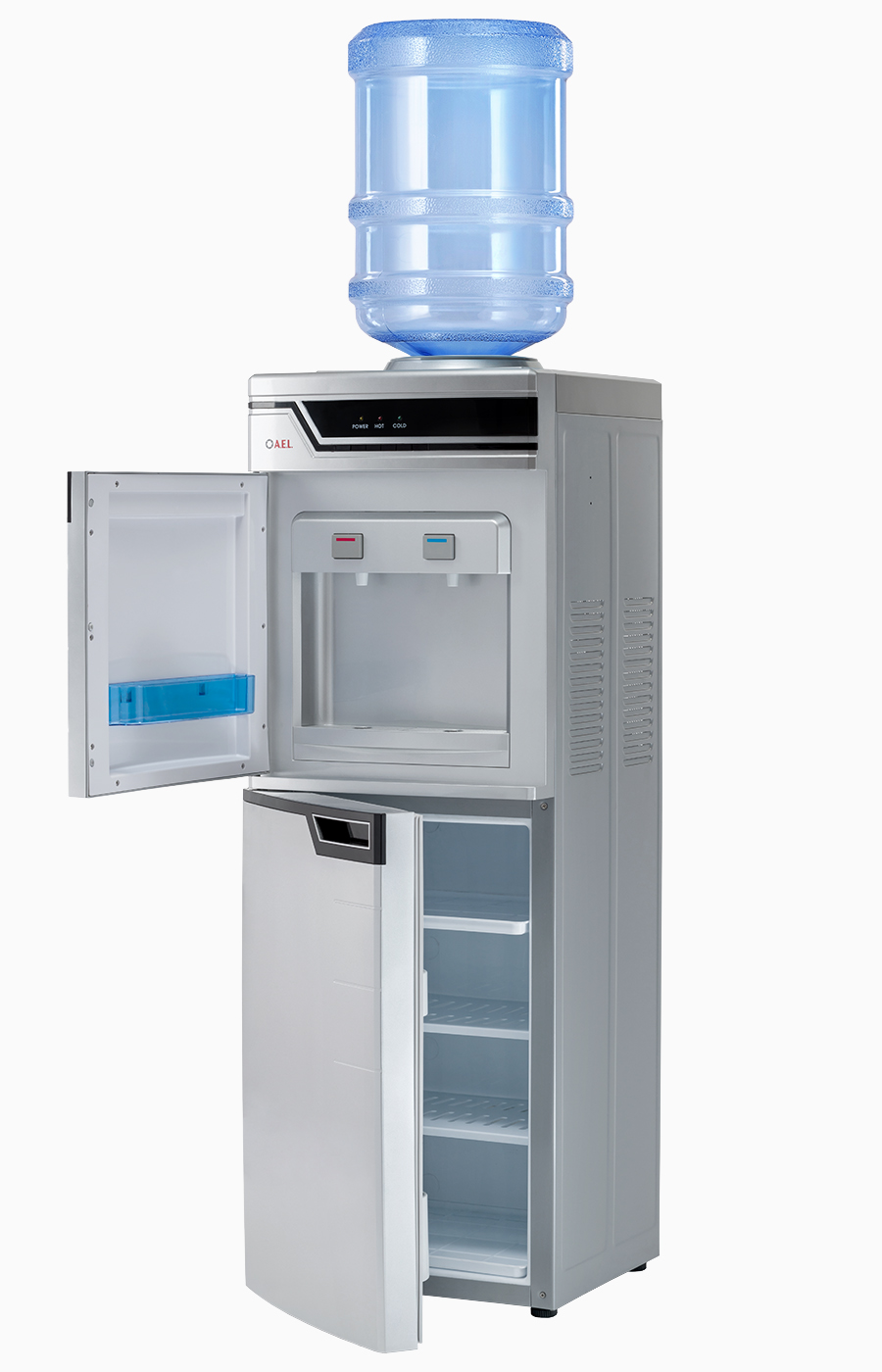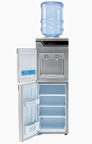 Высокая презентабельная модель серебристого цвета с компрессорным охлаждением. Оснащен вместительной 50-литровой холодильной камерой для хранения продуктов. Краны-клавиши холодной и горячей воды закрыты дверцей. Модель высокопроизводительная: за один час можно получить 5 литров горячей и 2 литра холодной воды. Отличное решение для офисов.