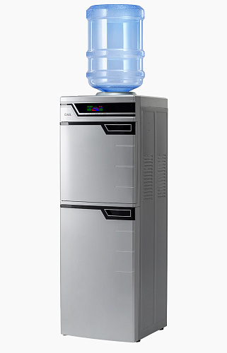 Высокая презентабельная модель серебристого цвета – удобное решение для установки в большом офисе. Кулер оснащен вместительной 50-литровой холодильной камерой для хранения продуктов. Модель высокопроизводительная: за один час можно получить 5 литров горячей и 2 литра холодной воды. Встроенный дисплей отображает все параметры работы устройства. Краны-клавиши закрыты дверцей.
