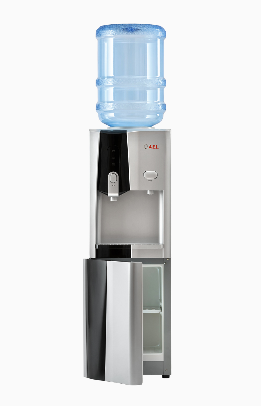 Красивая, элегантная модель серебристого цвета с черной вставкой. Удобная подача воды с помощью клавиш-кнопок на лицевой панели. Электронное охлаждение. Предусмотрен шкафчик 16 литров (≅240х160х320 мм).