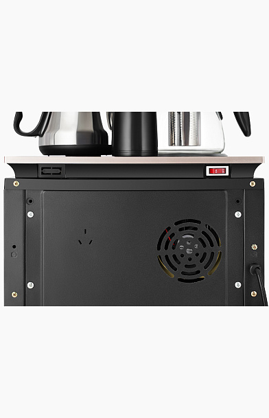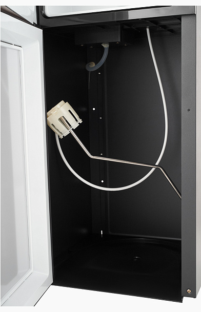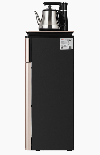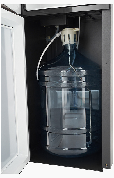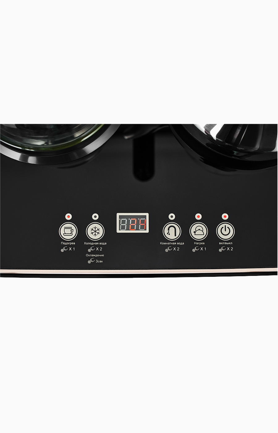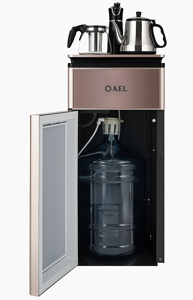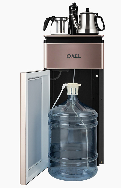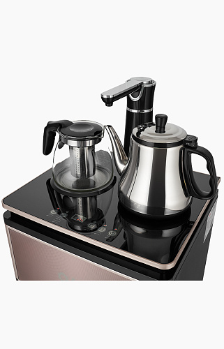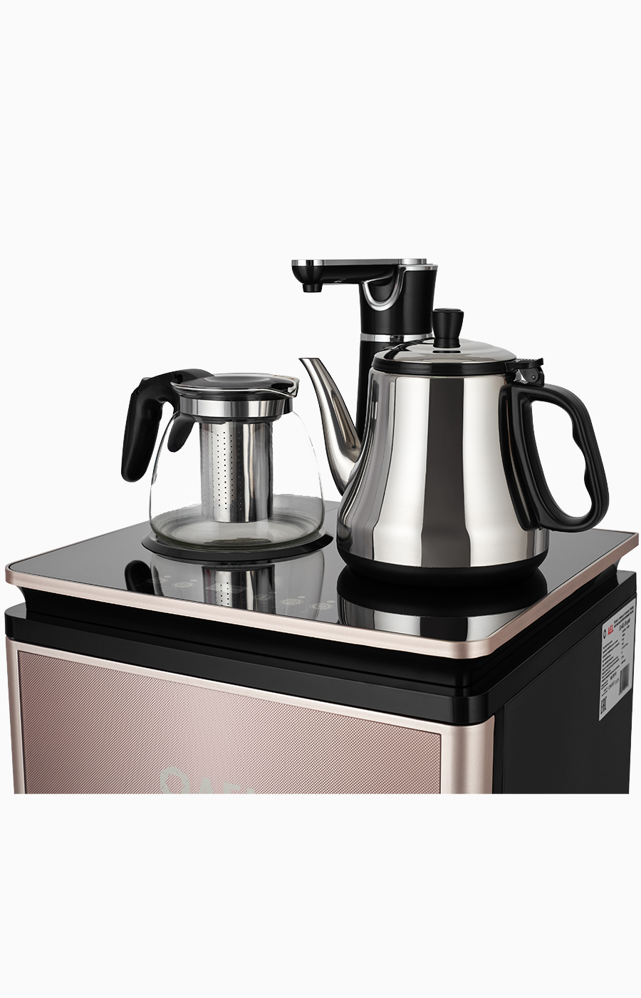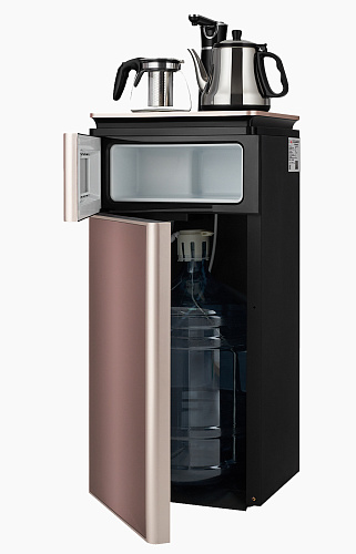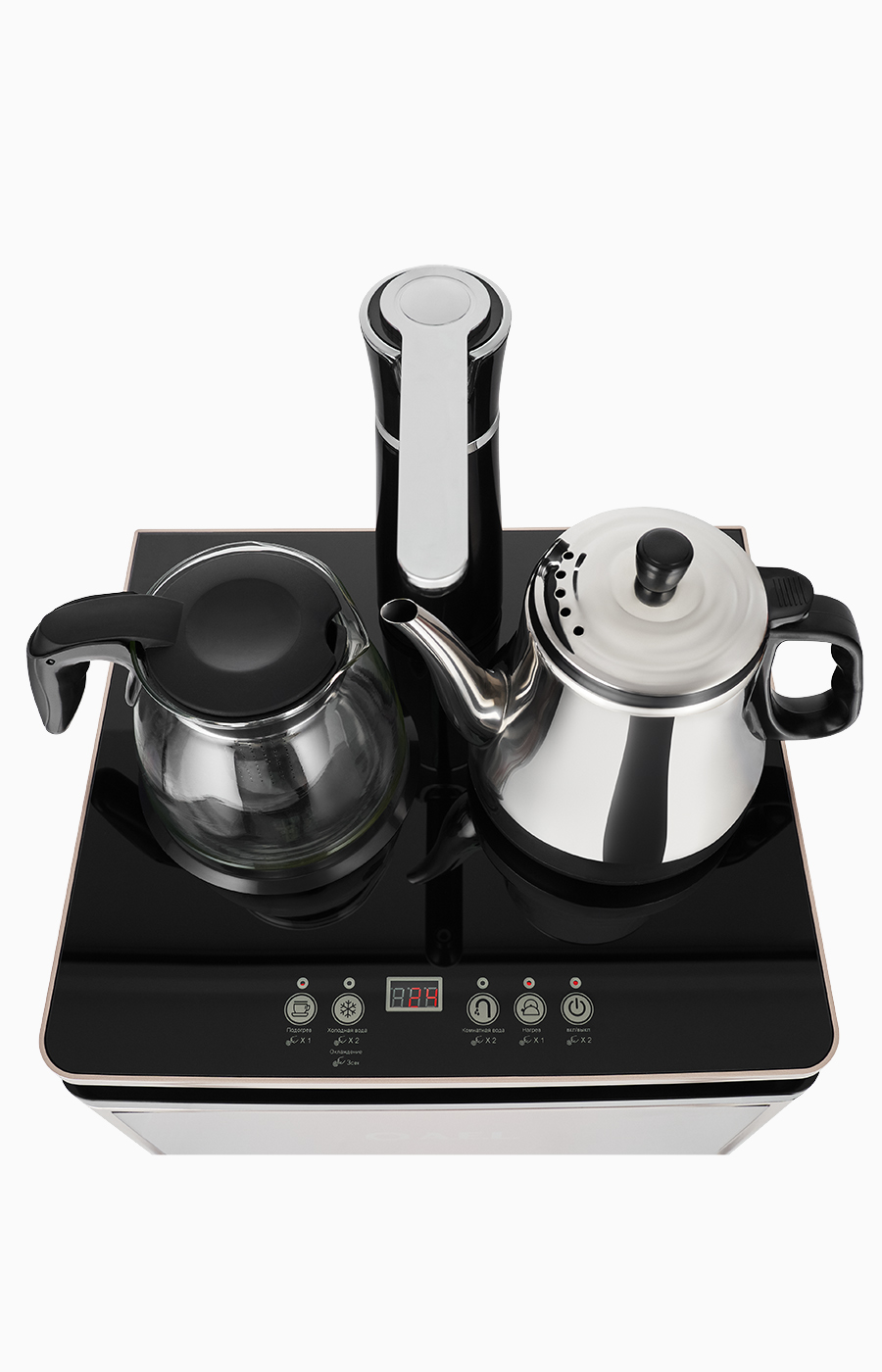 Оригинальное исполнение кулера с нижней загрузкой бутыли состоит из заварочного и электрического чайников, сенсорной панели управления, удобного крана подачи воды и шкафчика для хранения. Яркая световая индикация и информативный дисплей на сенсорной панели сообщат о текущем режиме и подключении к сети. Встроена защитная система от случайного нажатия и система подогрева заварного чайника, которая позволяет поддерживать температуру до 24 часов.