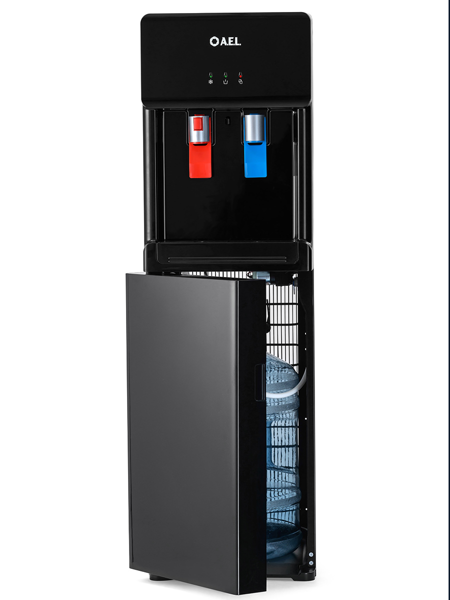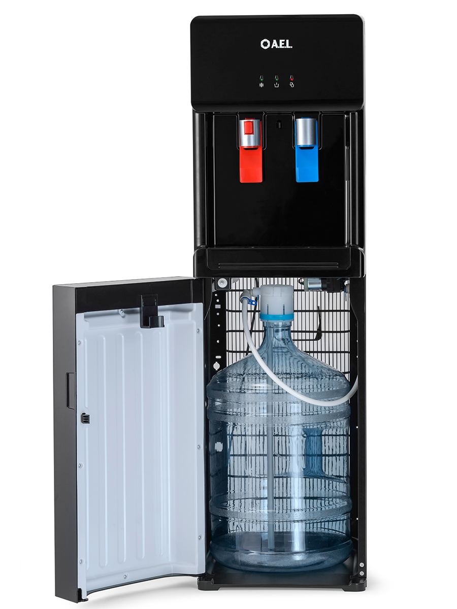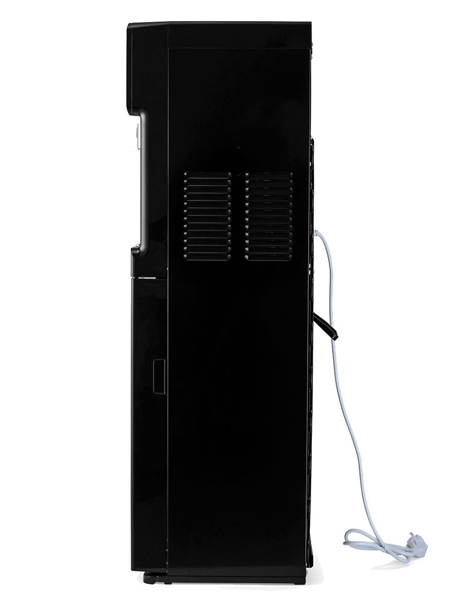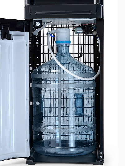 Компрессорный кулер с нижней загрузкой бутыли. После снятия крышки с бутыли Вам не надо поднимать её наверх. Просто установите трубку забора воды на бутыль и задвиньте внутрь шкафчика кулера. Основные части кулера выполнены из пластика, а боковые стенки из металла, что позволяет прикрепить держатель для стаканов на магните. На боковых стенках имеются технические отверстия и для крепления держателей на шурупах. Длинные удобные PUSH-краны с защитой от случайного нажатия на горячем кране. Широкий лоток для сбора капель. В процессе эксплуатации аппарата в тот момент, когда вода в бутыли закончилась, на панели индикации загорится индикатор наличия воды в бутыли. Это символизирует о том, что необходимо заменить пустую бутыль.