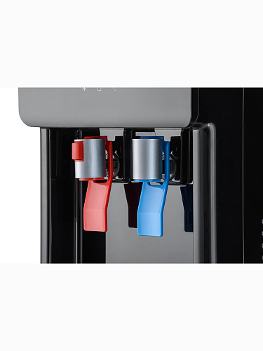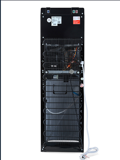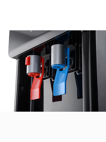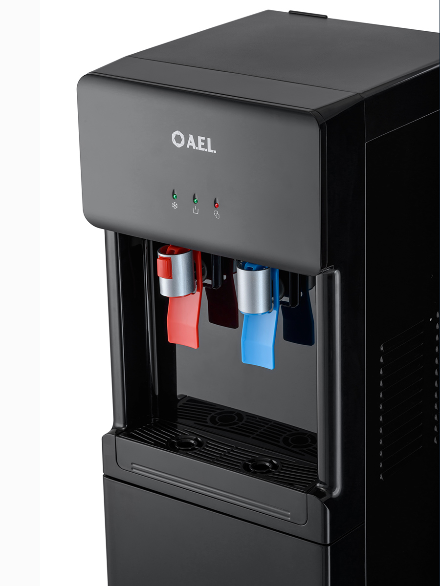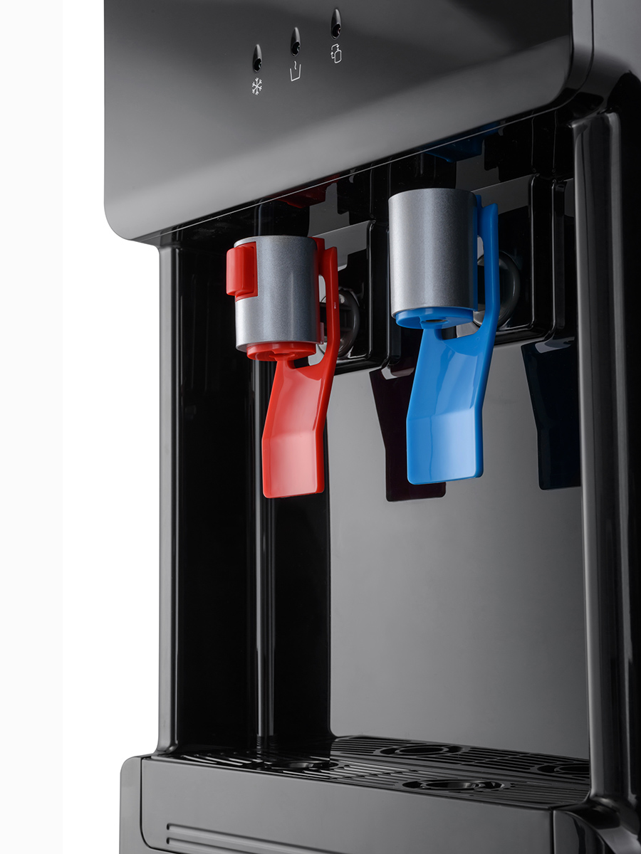Компрессорный кулер с нижней загрузкой бутыли. После снятия крышки с бутыли Вам не надо поднимать её наверх. Просто установите трубку забора воды на бутыль и задвиньте внутрь шкафчика кулера. Основные части кулера выполнены из пластика, а боковые стенки из металла, что позволяет прикрепить держатель для стаканов на магните. На боковых стенках имеются технические отверстия и для крепления держателей на шурупах. Длинные удобные PUSH-краны с защитой от случайного нажатия на горячем кране. Широкий лоток для сбора капель. В процессе эксплуатации аппарата в тот момент, когда вода в бутыли закончилась, на панели индикации загорится индикатор наличия воды в бутыли. Это символизирует о том, что необходимо заменить пустую бутыль.