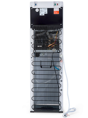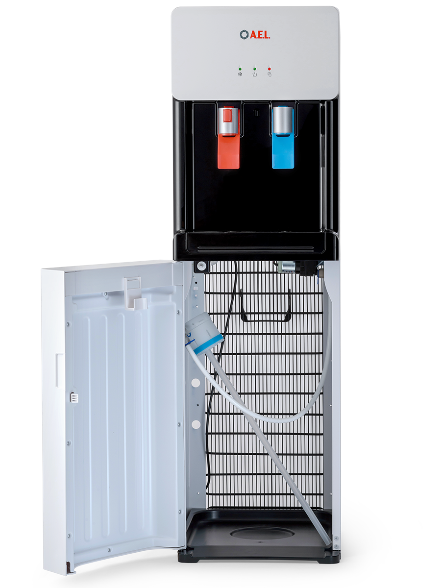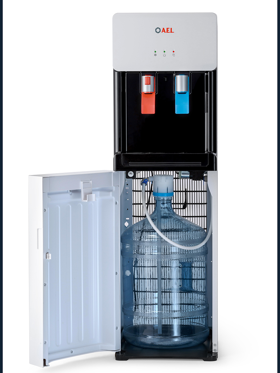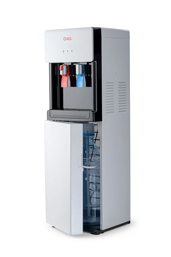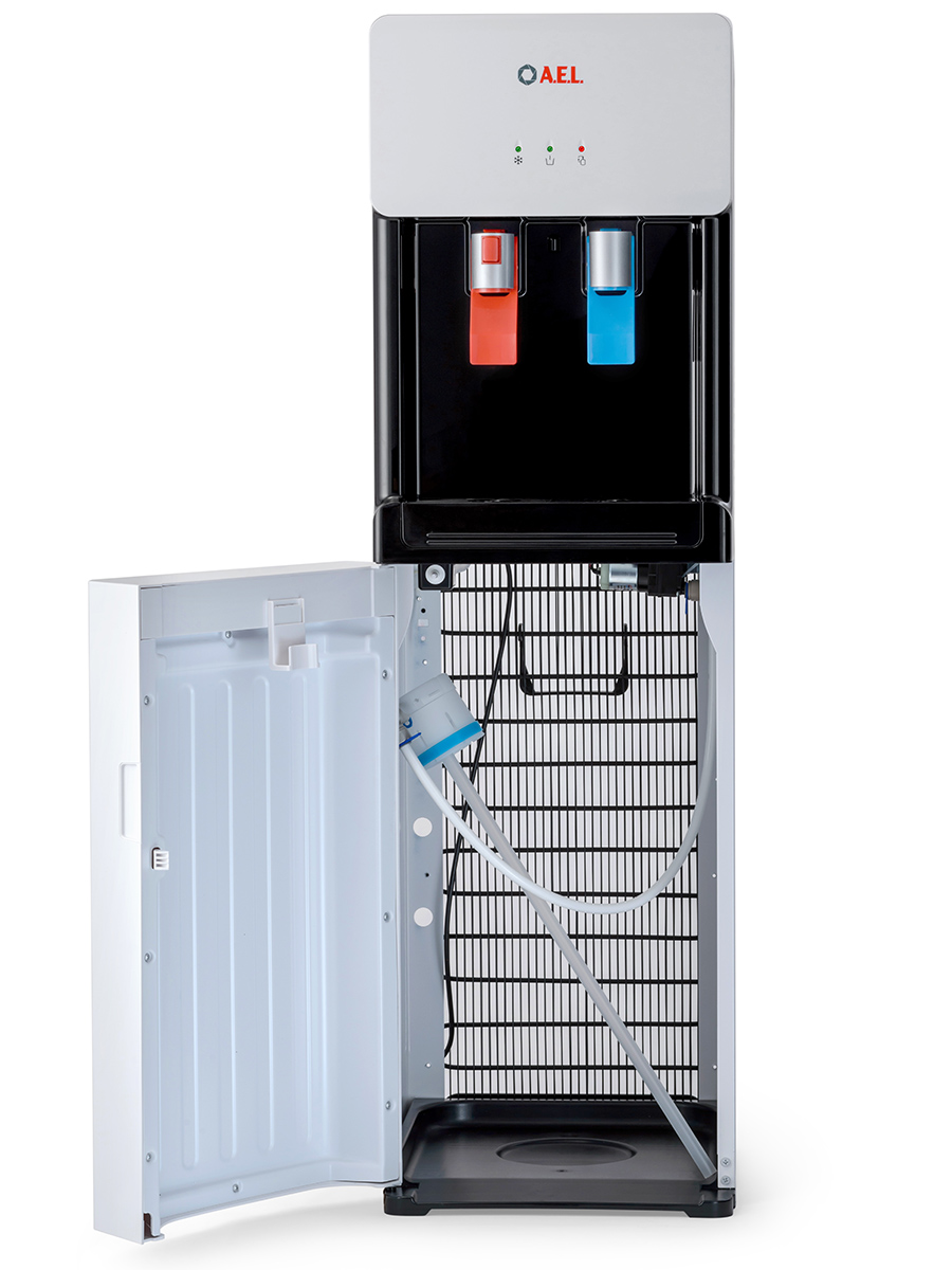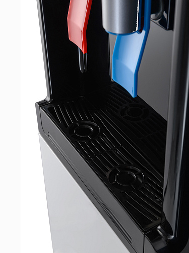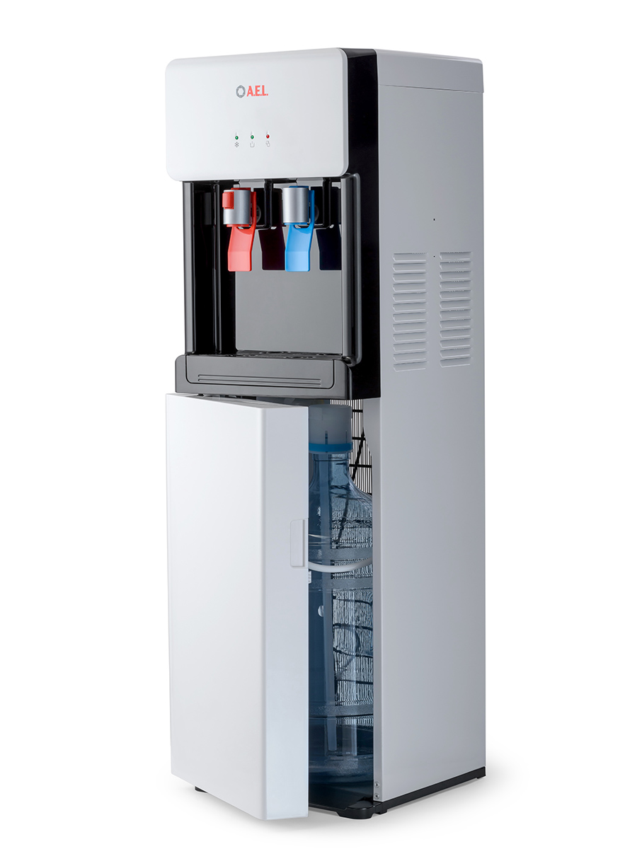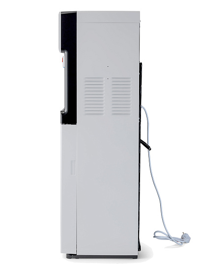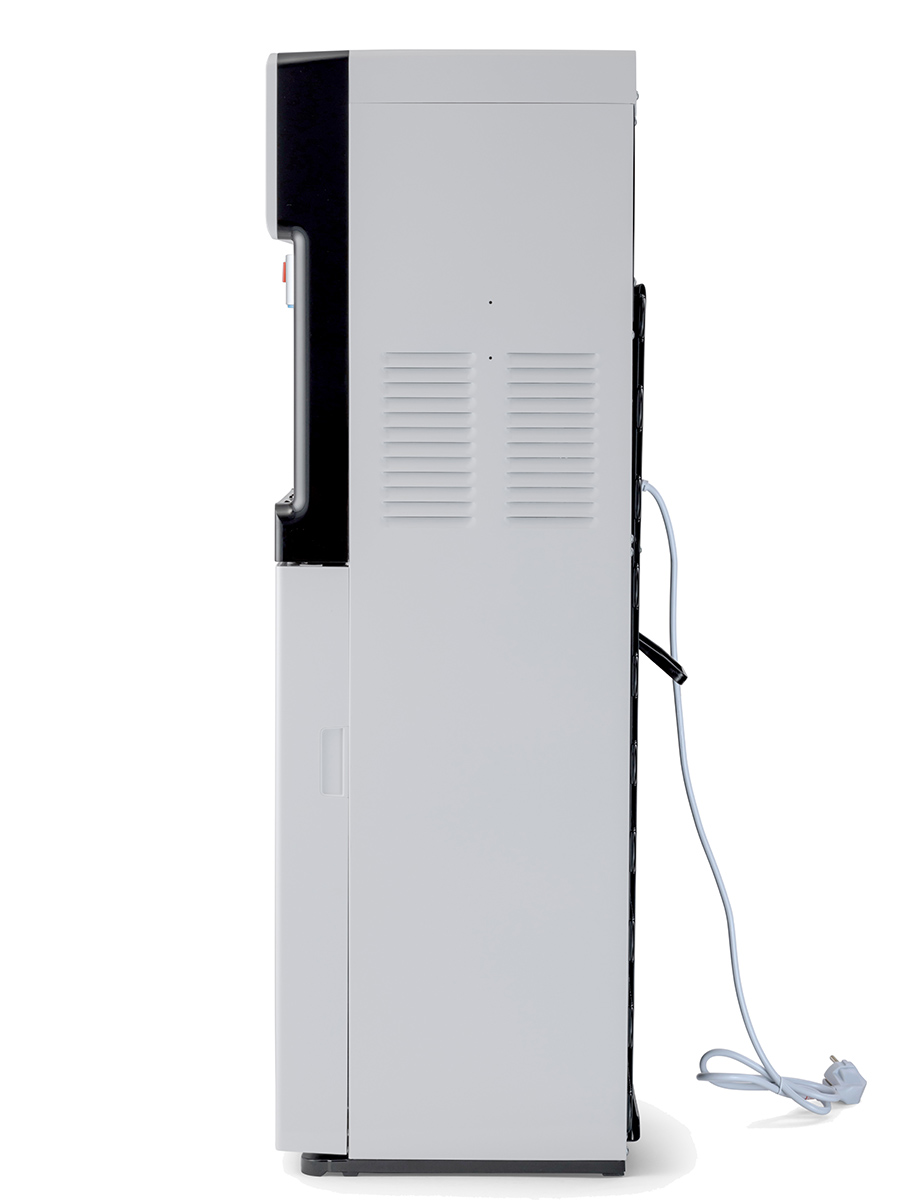 Компрессорный кулер с удобной нижней загрузкой бутыли. Основные части кулера выполнены из пластика, а боковые стенки из металла, что позволяет прикрепить держатель для стаканов на магните. На боковых стенках имеются технические отверстия и для крепления держателей на шурупах. Длинные удобные PUSH-краны с защитой от случайного нажатия на горячем кране.