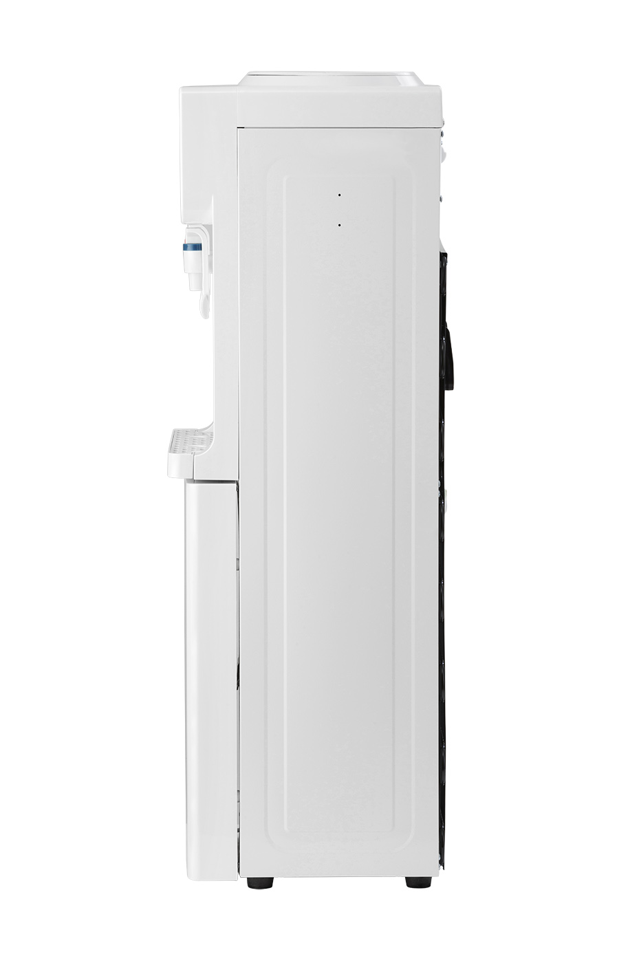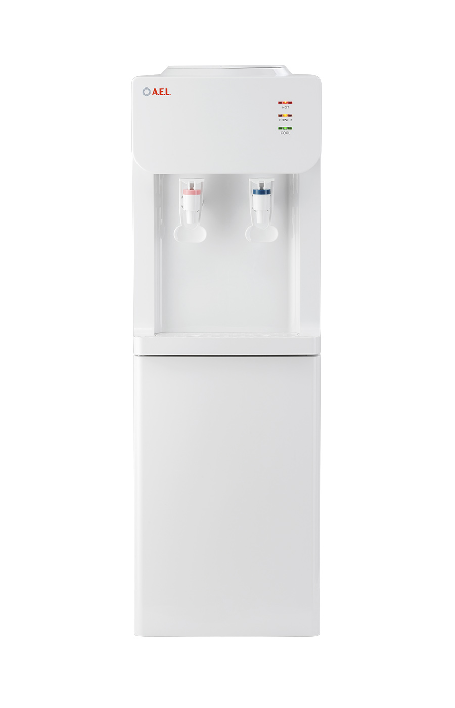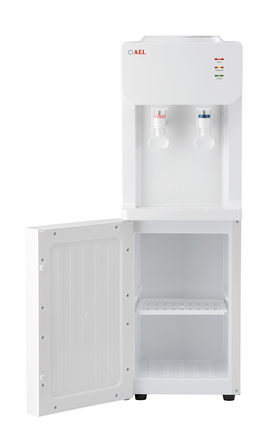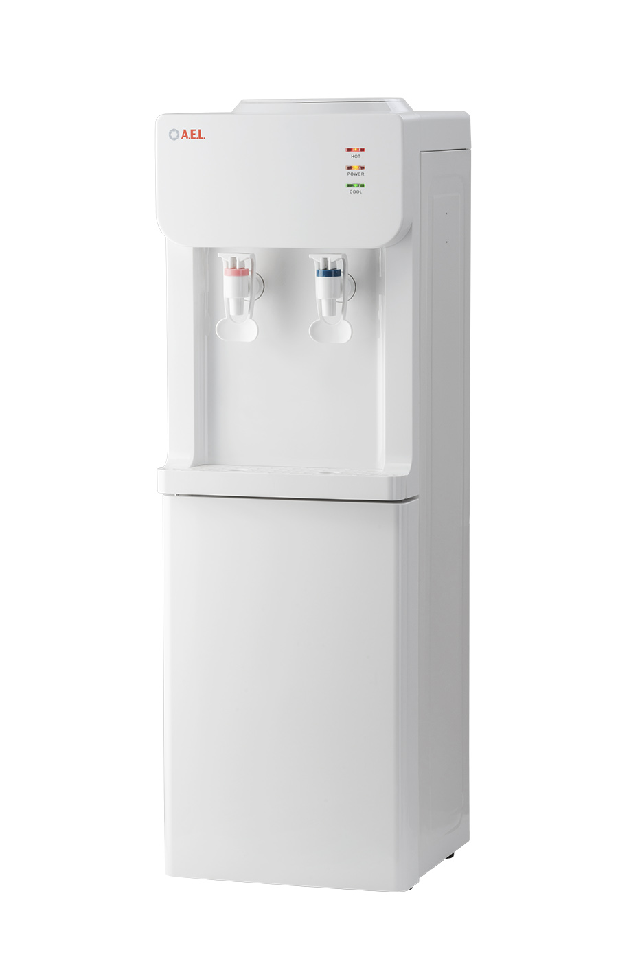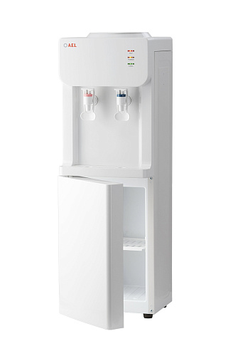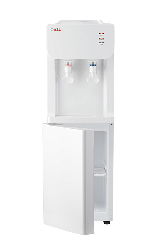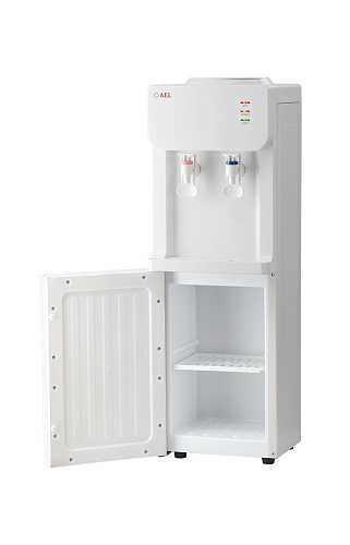 Напольный кулер с компрессорным охлаждением, нагревом и шкафчиком для продуктов. Удобные краны "нажим чашкой"с внутренней резьбой, малые габариты, высота 83см. Цвет: белый.