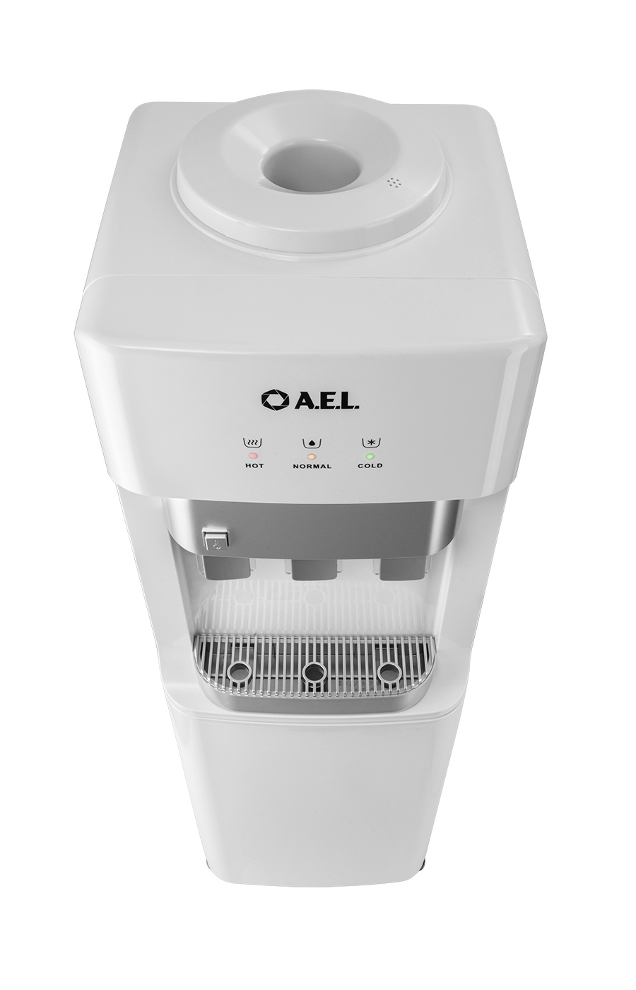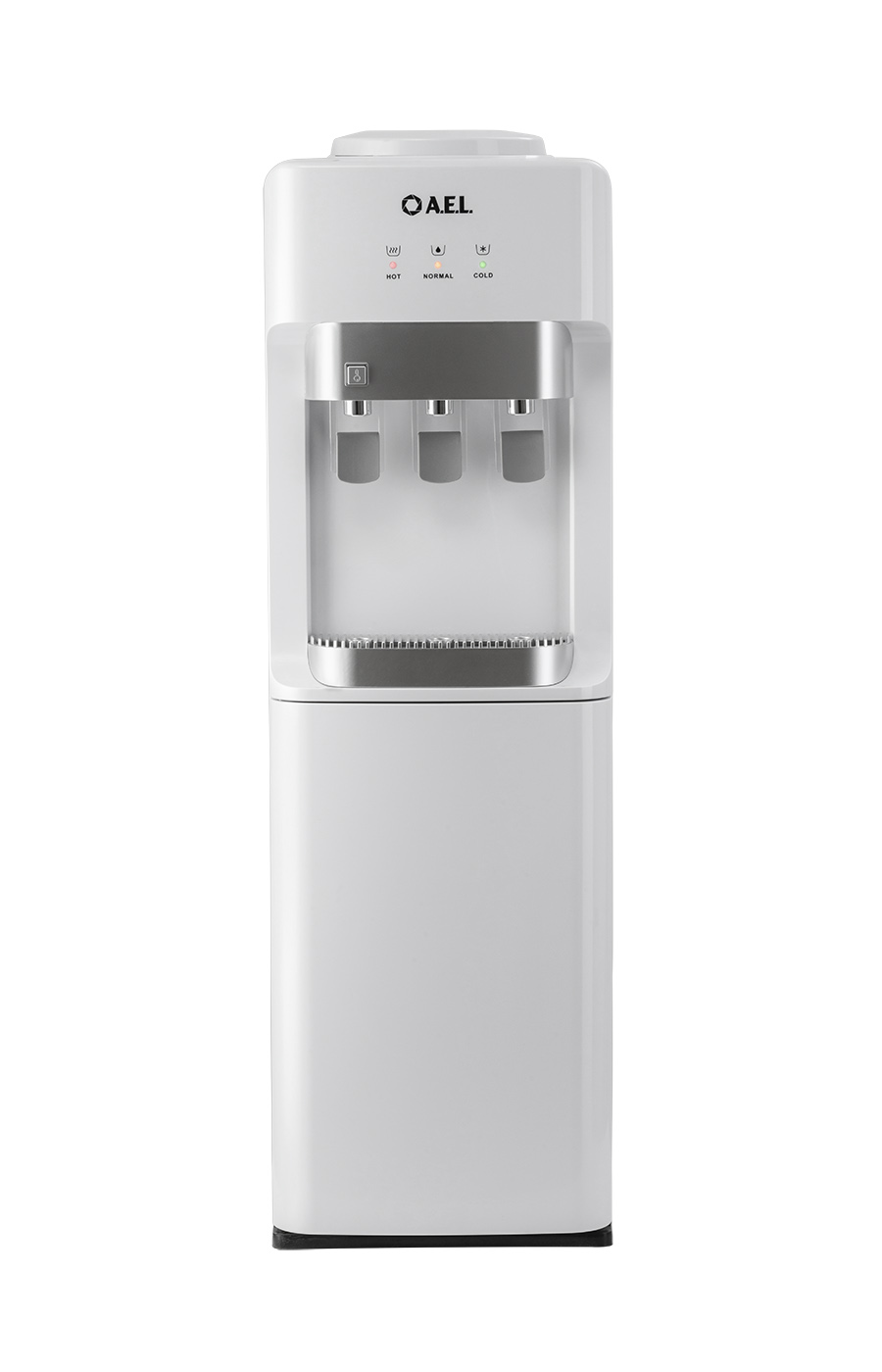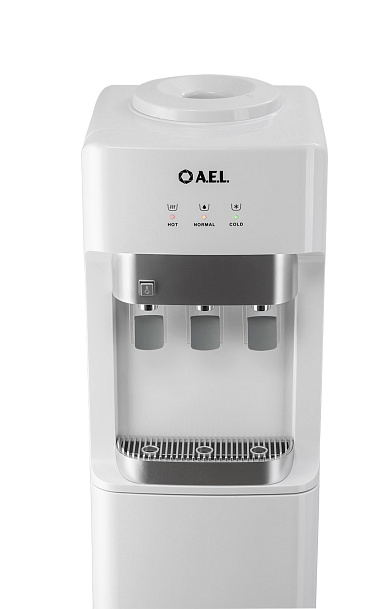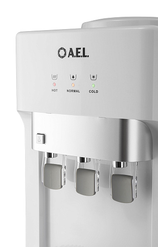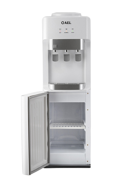 Новинка в ассортиментной линейке АЕЛ - напольный кулер с электронным охлаждением и шкафчиком для продуктов. Интересный дизайн на лицевой панели, удобные краны "нажим чашкой". Три крана горячей/комнатной/холодной температуры. Защита от случайного нажатия на кране горячей воды. Цвет: белый с серебряной вставкой.