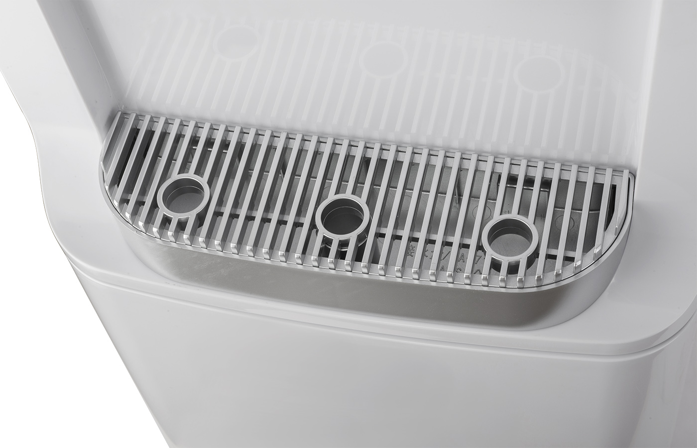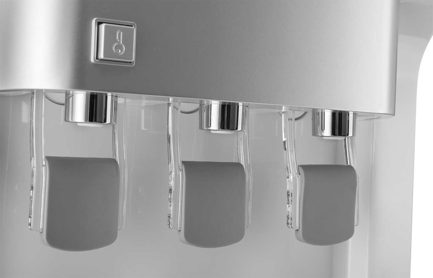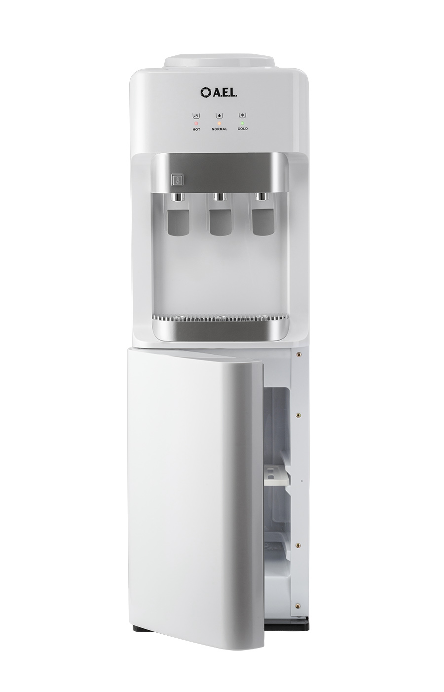 Новинка в ассортиментной линейке АЕЛ - напольный кулер с электронным охлаждением и шкафчиком для продуктов. Интересный дизайн на лицевой панели, удобные краны "нажим чашкой". Три крана горячей/комнатной/холодной температуры. Защита от случайного нажатия на кране горячей воды. Цвет: белый с серебряной вставкой.