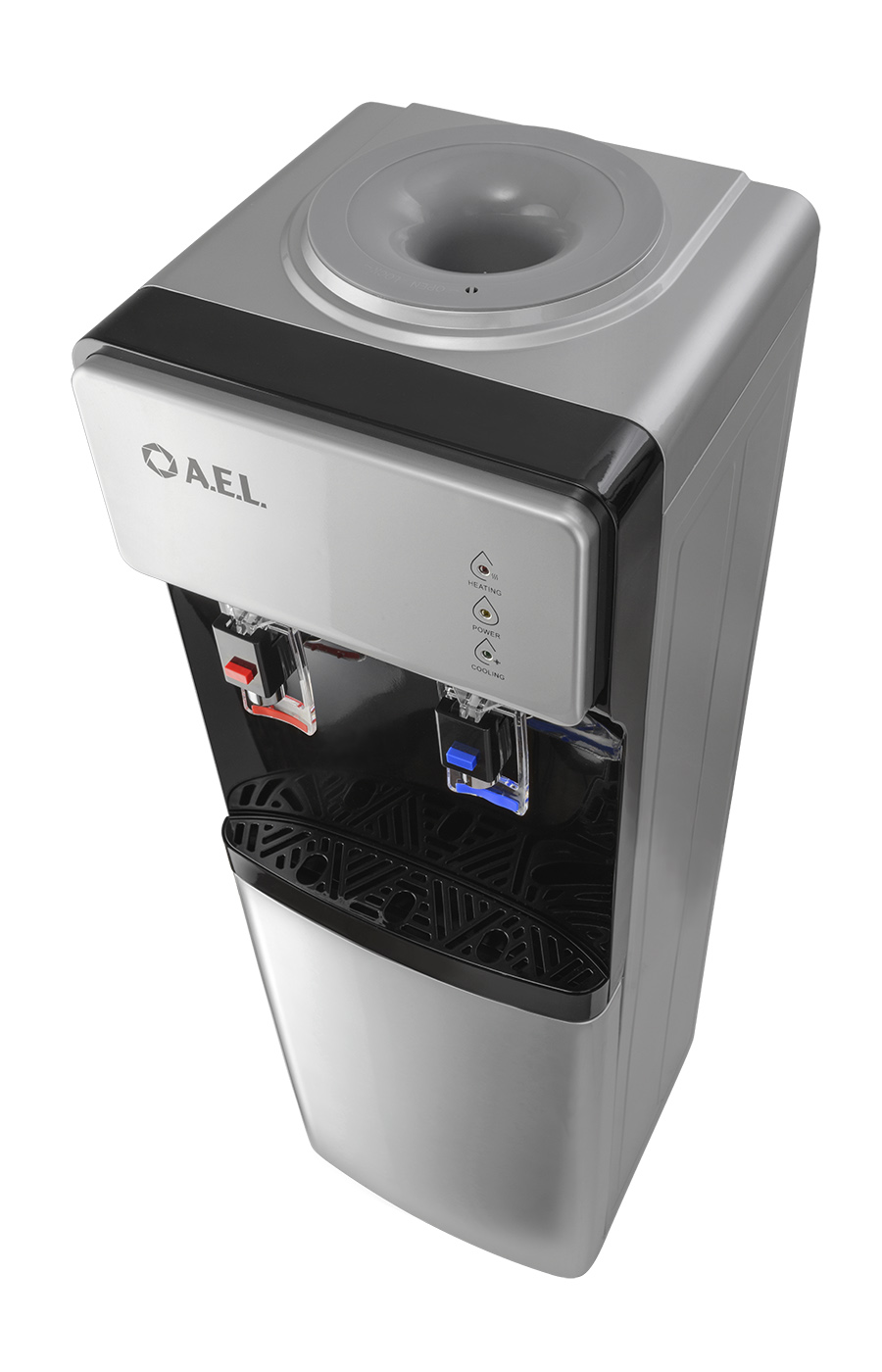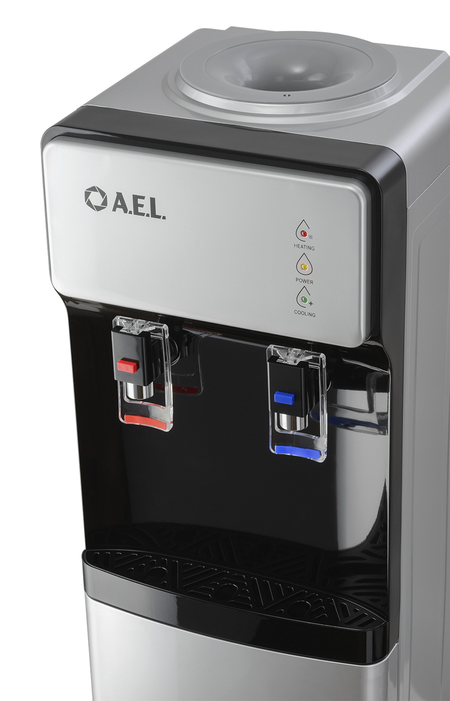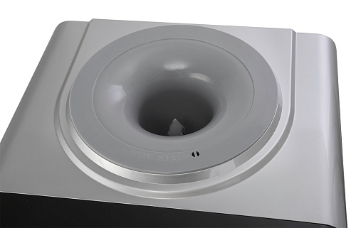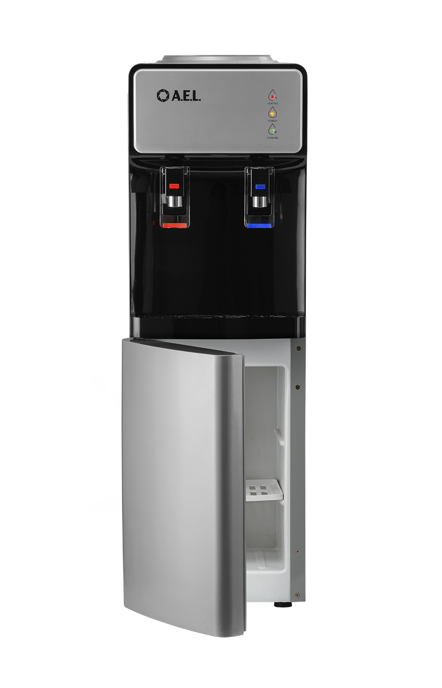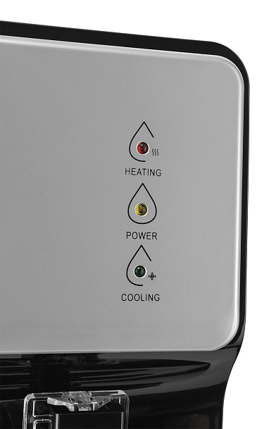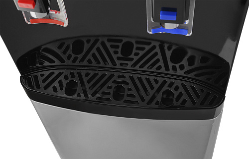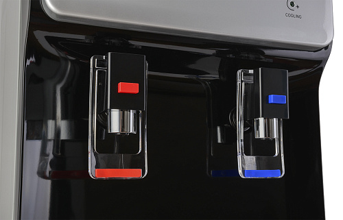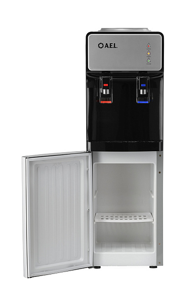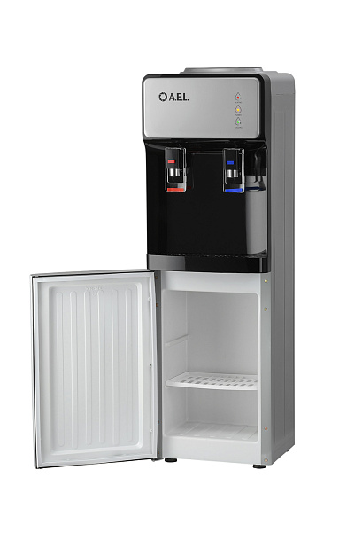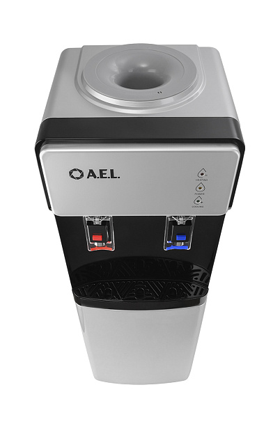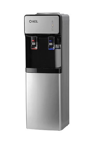 Новинка в ассортименте АЕЛ - напольный кулер с верхней загрузкой бутыли, электронное охлаждение. Раздача воды горячей и холодной температуры. Лицевая панель черного цвета с серебристой вставкой. Боковые серого цвета. Защита на кране горячей воды. Имитация защиты от случайного нажатия в дизайне крана холодной воды.