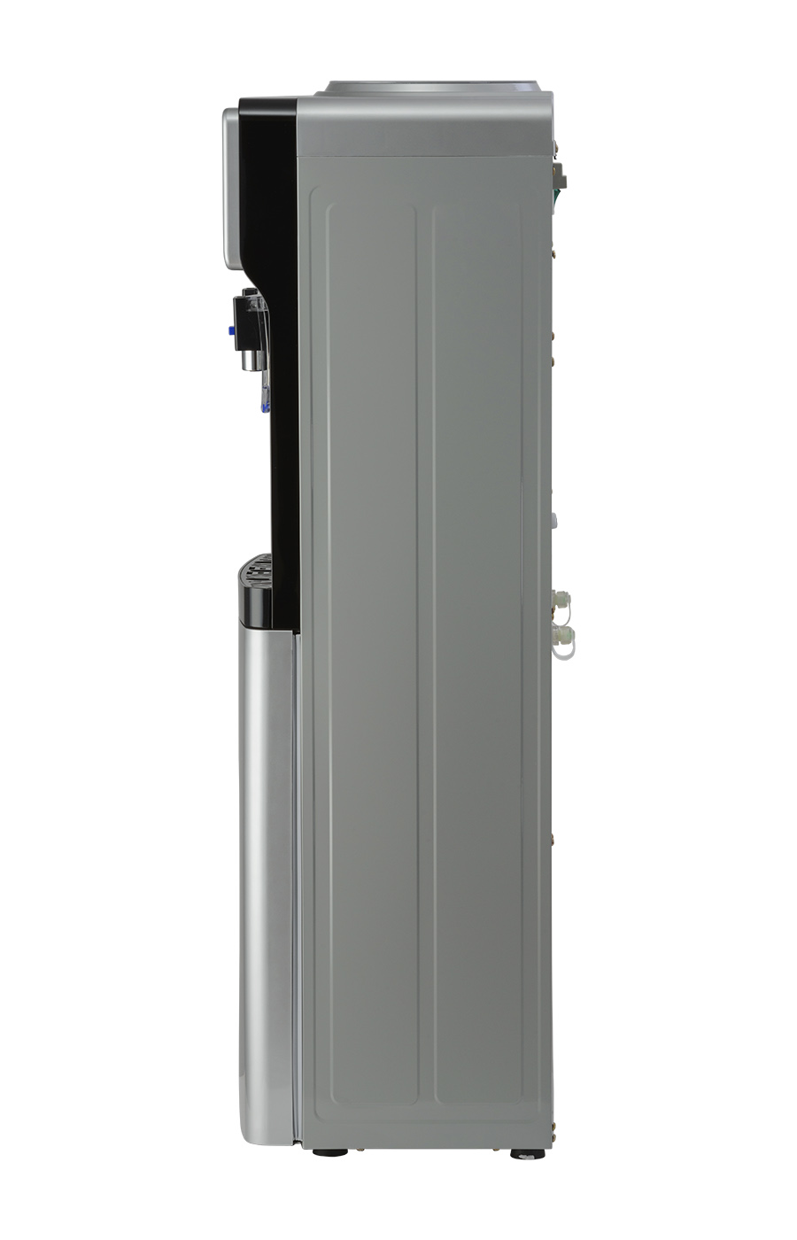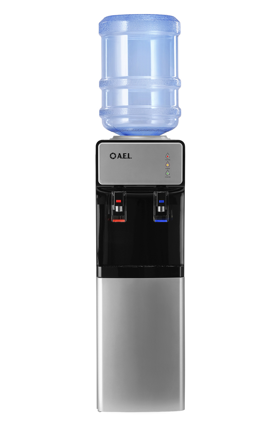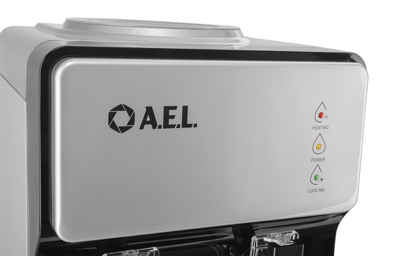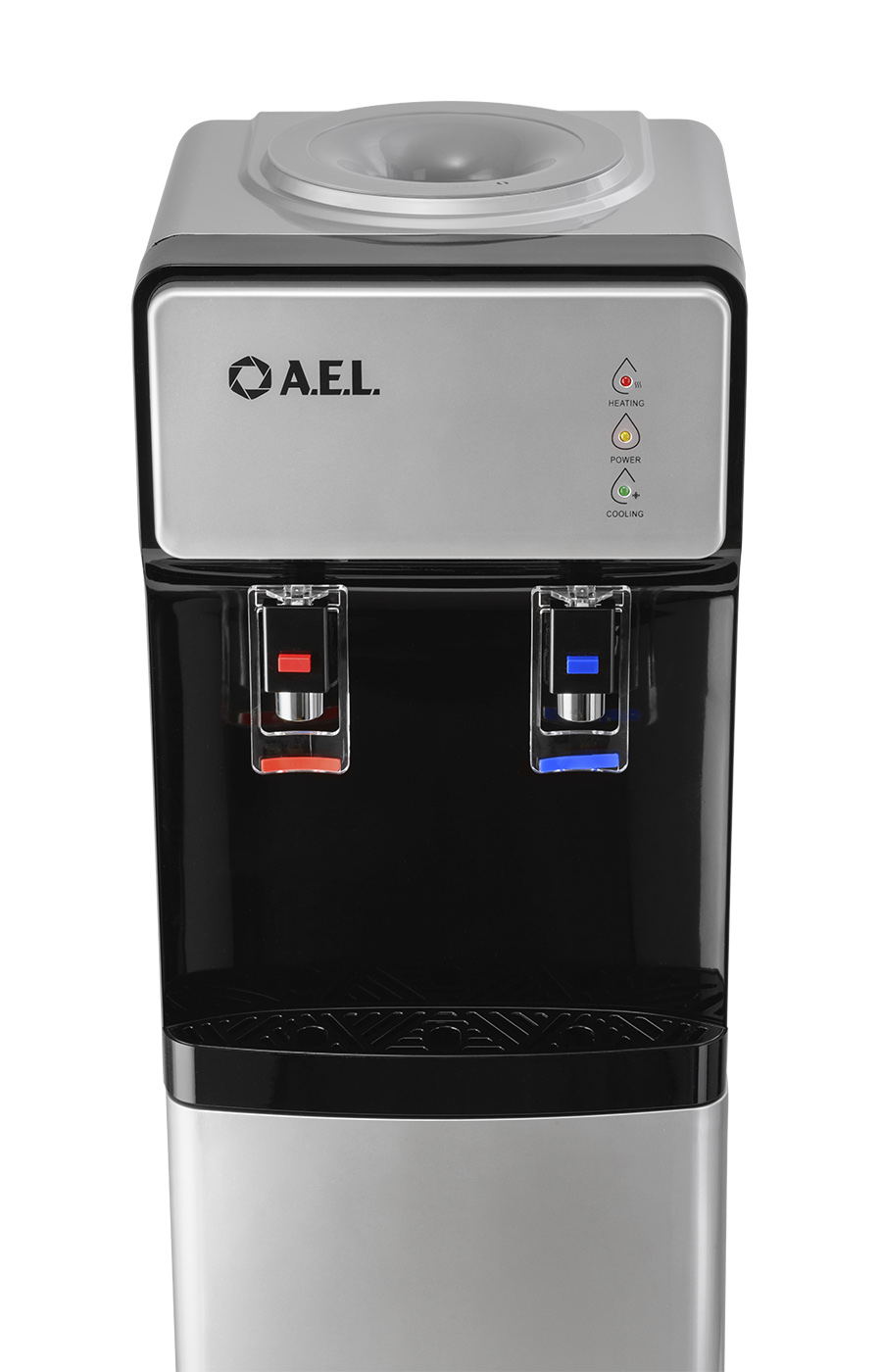 Новинка в ассортименте АЕЛ - напольный кулер с верхней загрузкой бутыли, электронное охлаждение. Раздача воды горячей и холодной температуры. Лицевая панель черного цвета с серебристой вставкой. Боковые серого цвета. Защита на кране горячей воды. Имитация защиты от случайного нажатия в дизайне крана холодной воды.