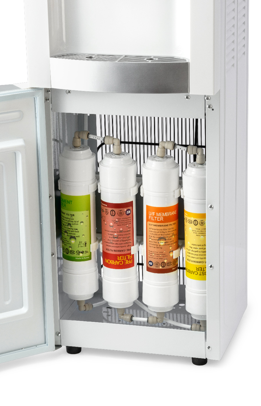Представляем новинку в ассортименте AQUA ALLIANCE - напольный пурифайер компрессорного типа с 4х UF-системой очистки. Модель комплектована внешним нагревательным элементом и баком нагрева 1,2л, удобными краниками белого цвета нажим чашкой с внутренней резьбой. Цвет: белый корпус с серебрянными вставками, боковые панели белого цвета. Комплектация: кран врезки, трубка 1/4 - 3 метра, фильтры тип - I тип, фильтры размер - 11", инструкция. Для того чтобы пурифайер производил воду постоянного высокого качества и вкуса, необходимо регулярно производить замену фильтров. Для замены подойдут фильтры Aquaalliance 14 и 12 размера , I и U тип - взаимозаменяемы http://www.akva-mir.ru/pages/zamenyaem_14-e_filtryi_na_12-e/