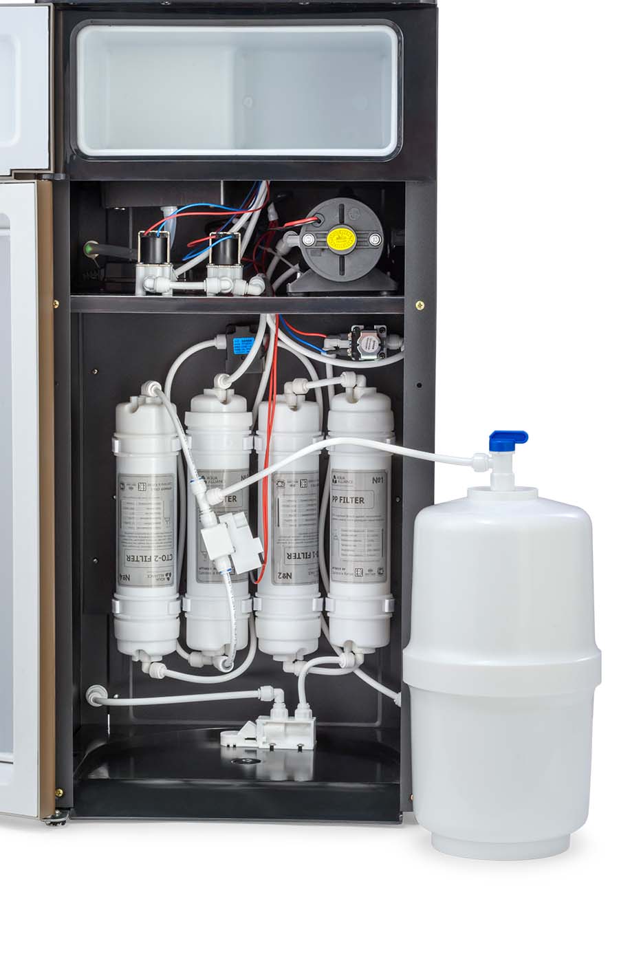 Оригинальное исполнение пурифайера с RO-фильтрацией состоит из заварочного и электрического чайников, сенсорной панели управления, удобного крана подачи воды и шкафчика для хранения. Яркая световая индикация и информативный дисплей на сенсорной панели сообщат о текущем режиме и подключении к сети. Встроена защитная система от случайного нажатия и система подогрева заварного чайника, которая позволяет поддерживать температуру до 24 часов.